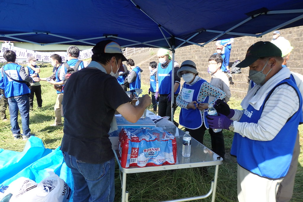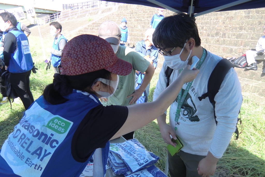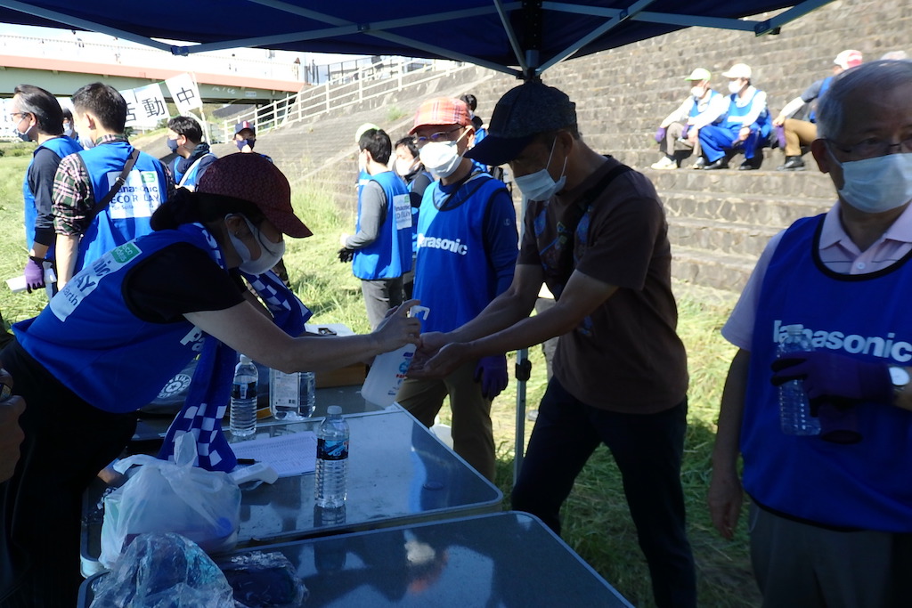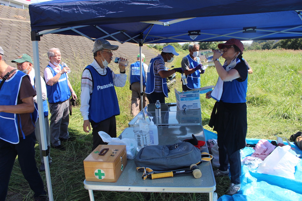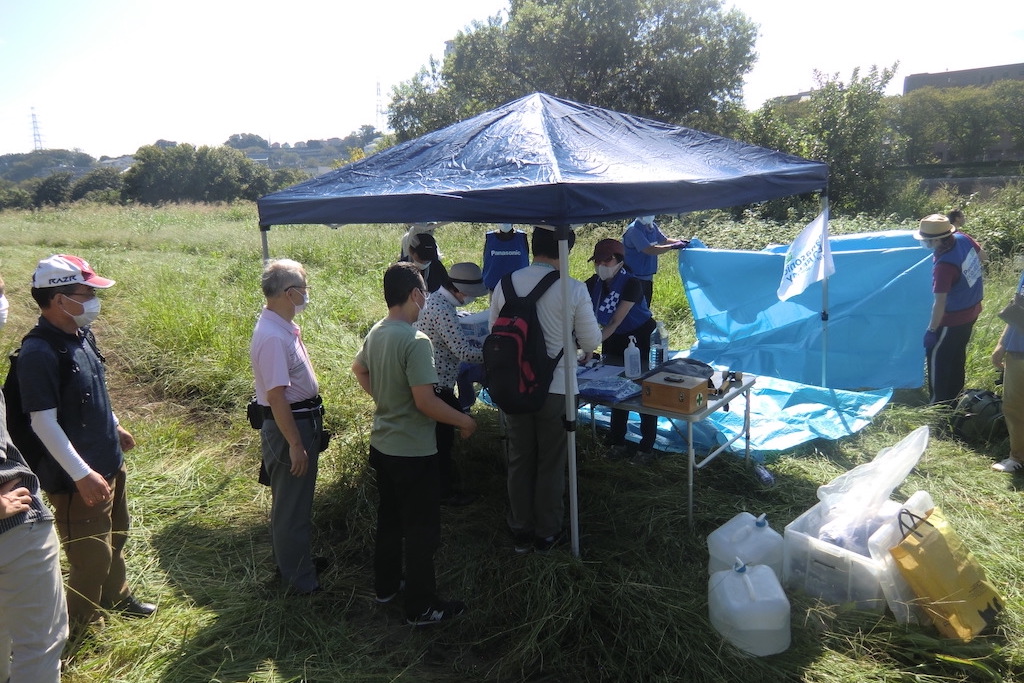 コロナ禍での鶴見川もこれで3回目。いつもの体温測定・手指のアルコール消毒・体調の問診を受付で実施し、ペットボトル水を配布、新型コロナと熱中症の両方に万全の対策を施しました。