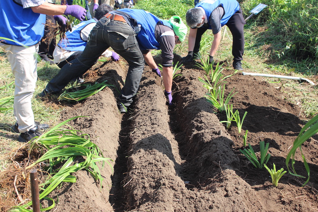 今回は、植え付けのための畝を作り、野萱草を株分けし、植え付けをおこない、雑草などの除去も実施しました。
