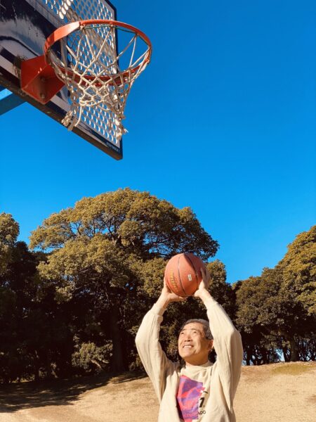 ⼤学時代の同好会仲間とは年に 1 回、バスケットボールを楽しんでいます。今年の 10 月には第 32 回⼤会を米沢で開催予定です。平均年齢が 75 歳以上となり、コート 1 面を使った試合は厳しいため、ハーフコートで 3 対 3 の試合を 2 分間⾏い、1 分休憩を挟んでいます。⼤会に向けて、公園のバスケットゴールでの練習を始めました。