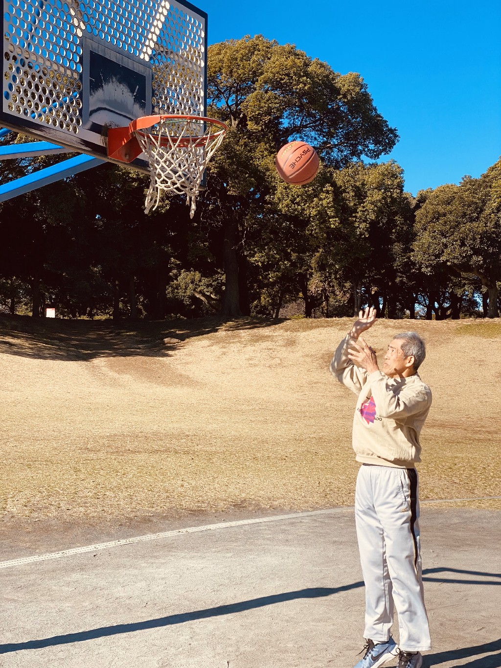 ⼤学時代の同好会仲間とは年に 1 回、バスケットボールを楽しんでいます。今年の 10 月には第 32 回⼤会を米沢で開催予定です。平均年齢が 75 歳以上となり、コート 1 面を使った試合は厳しいため、ハーフコートで 3 対 3 の試合を 2 分間⾏い、1 分休憩を挟んでいます。⼤会に向けて、公園のバスケットゴールでの練習を始めました。