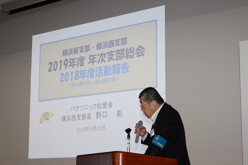 野口統括支部長の開会の挨拶で、横浜東・西支部合同2019年年次支部総会が開始されました。