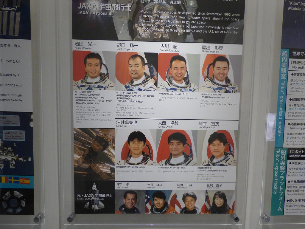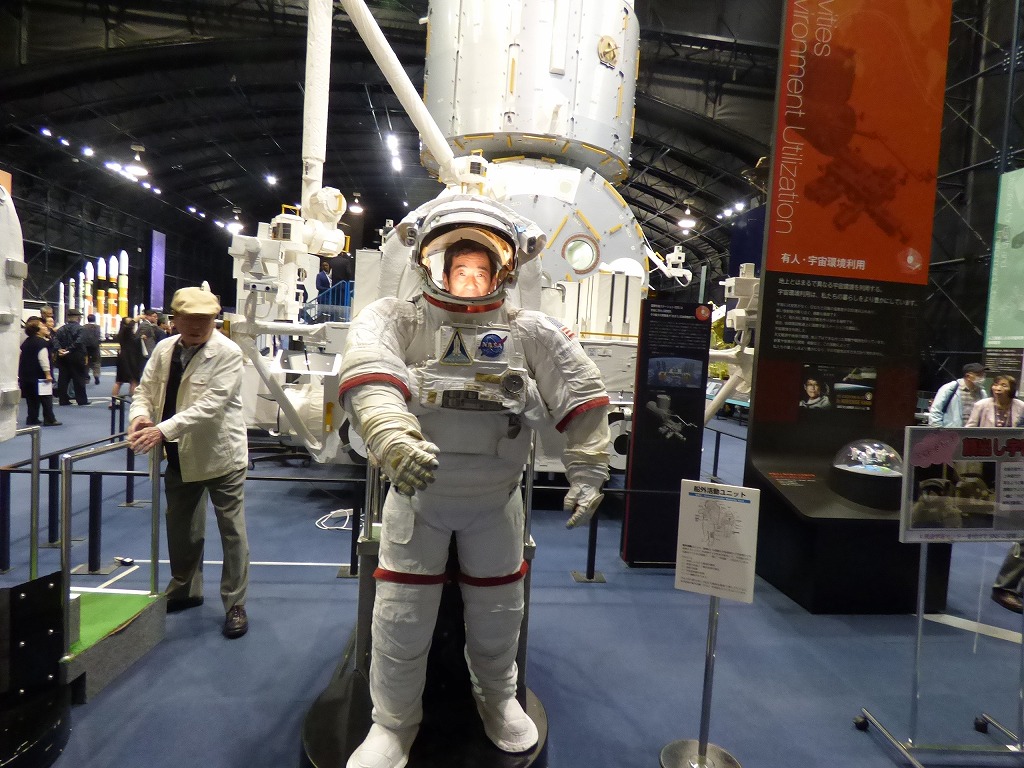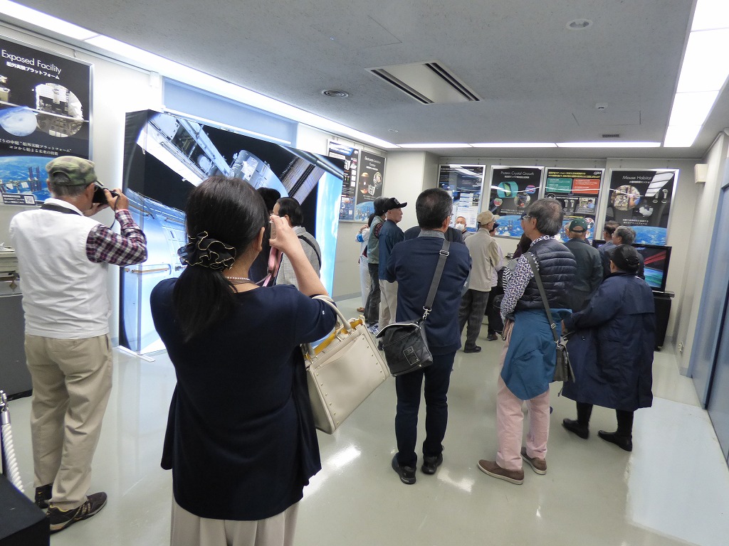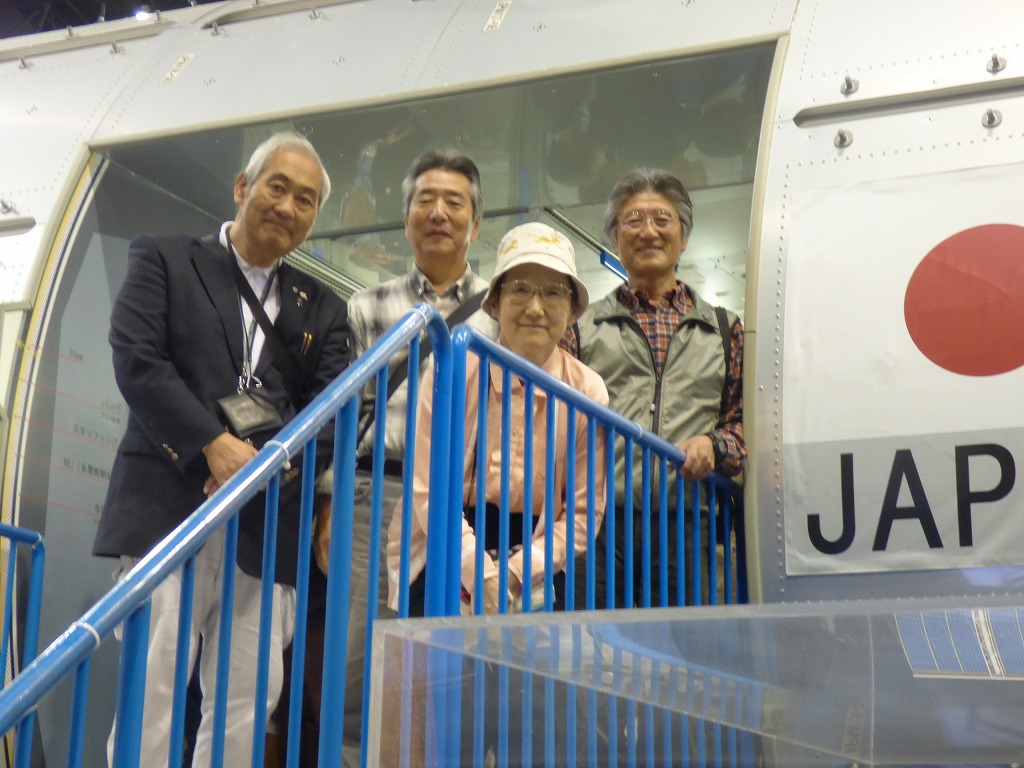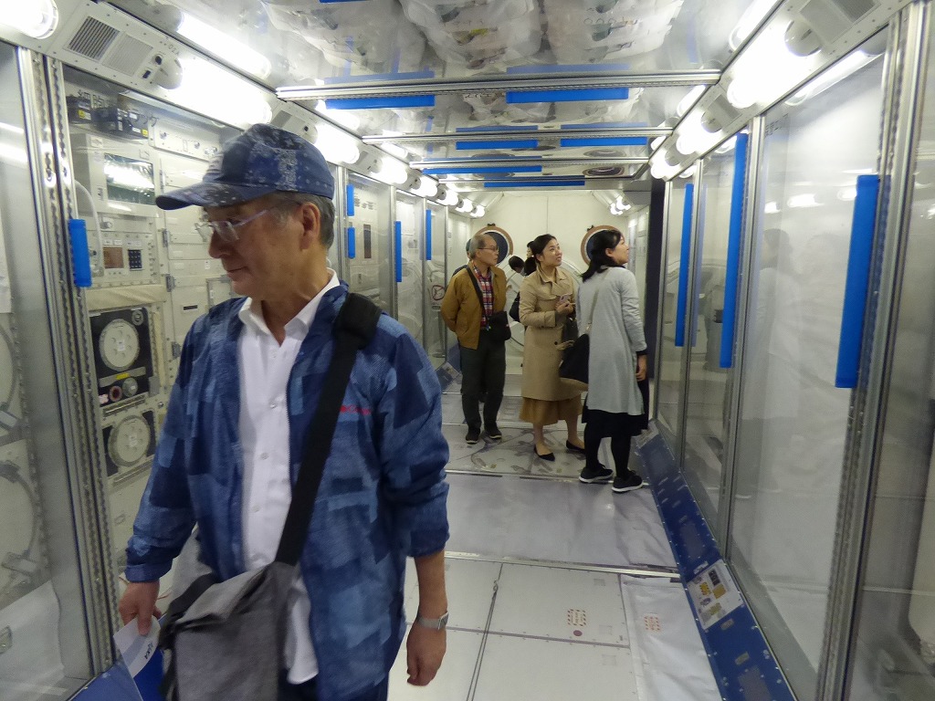 自由見学の展示館「スペースドーム」では、日本の宇宙開発の推進役であるJAXAの活動の歴史と現状についての展示を観て、触って確かめ、また国際宇宙ステーション(ISS)の日本実験棟「きぼう」の実物の内部を体感しました。