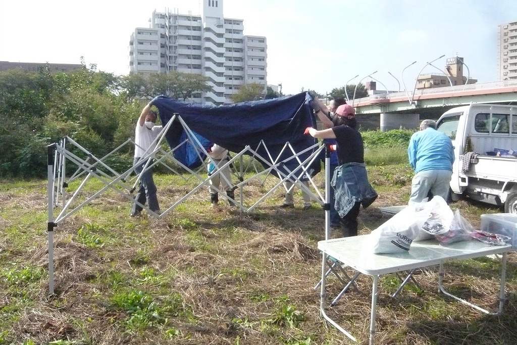 軽トラで道具やテーブルなどを搬入して、テントの設営作業です。