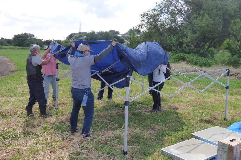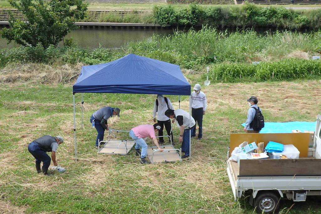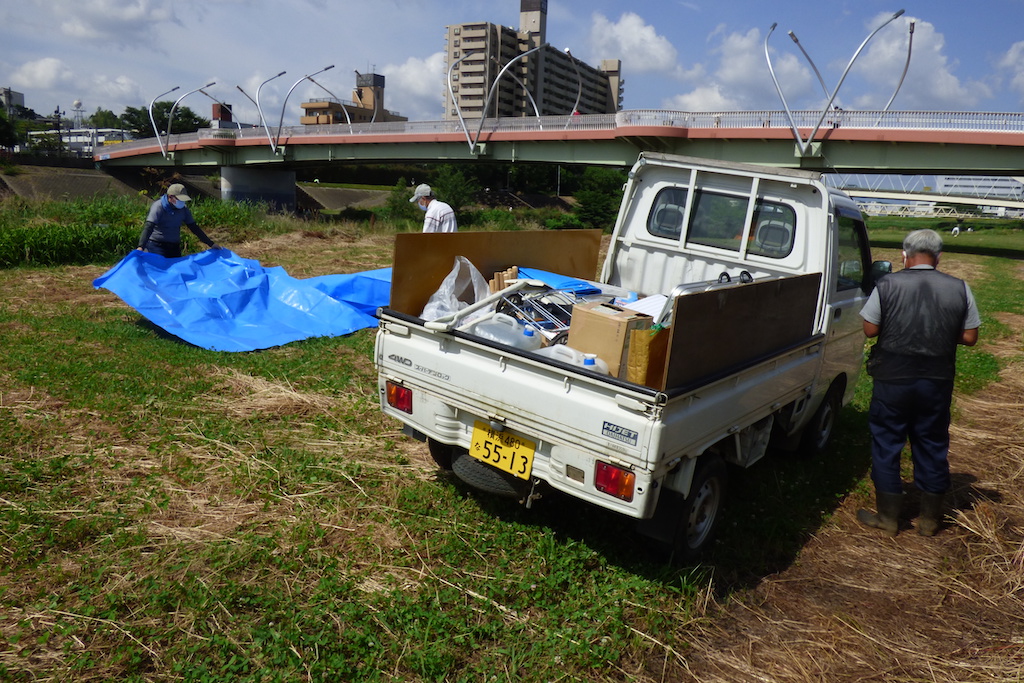 8時半、佐江戸の倉庫から道具やテーブルなどを搬出して、軽トラで河川敷に輸送完了です。