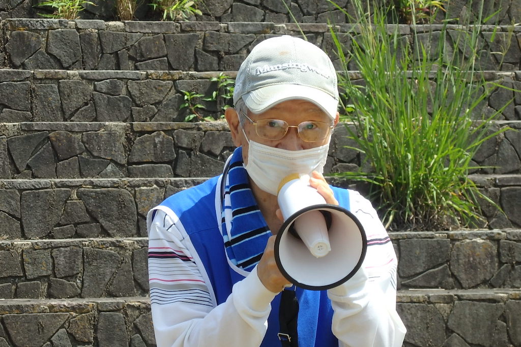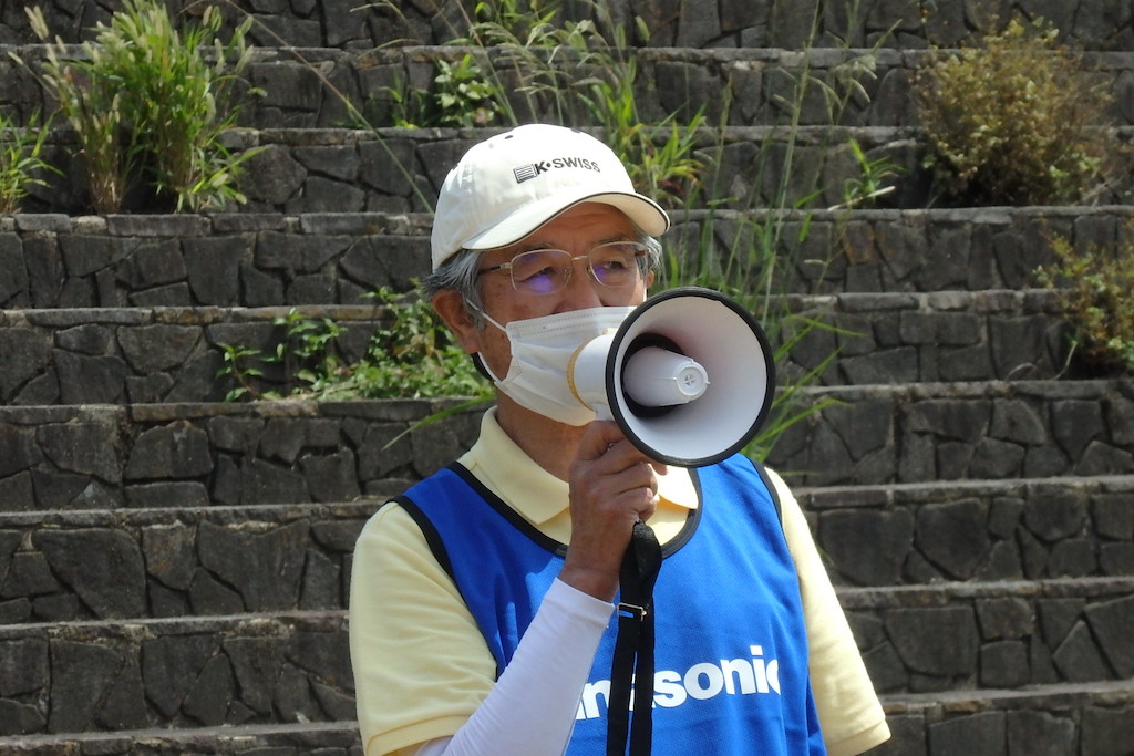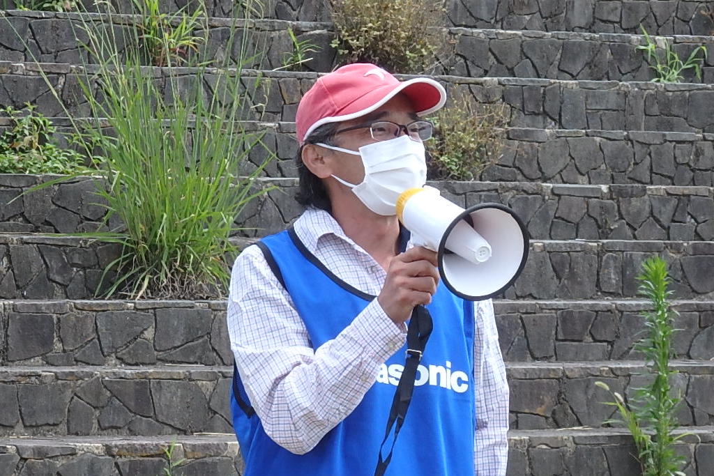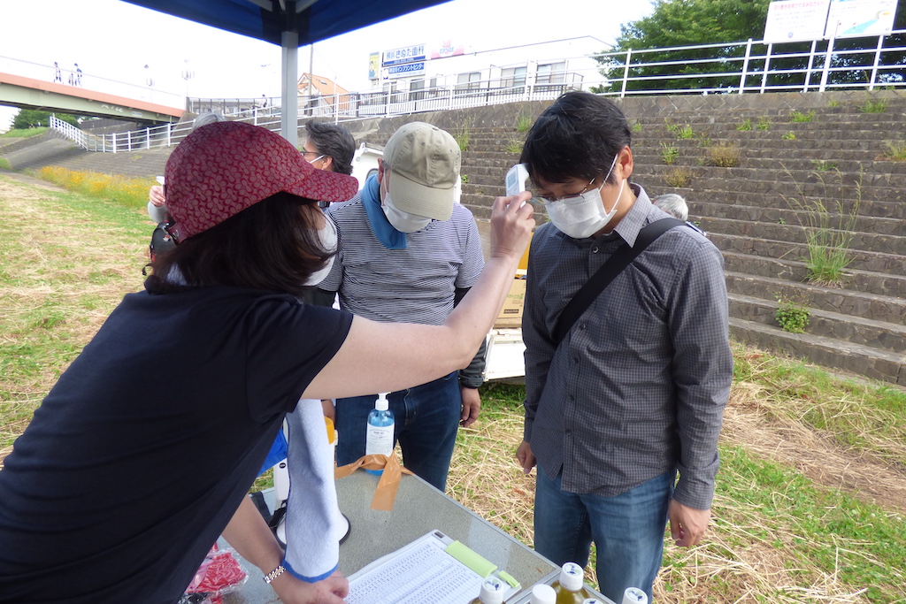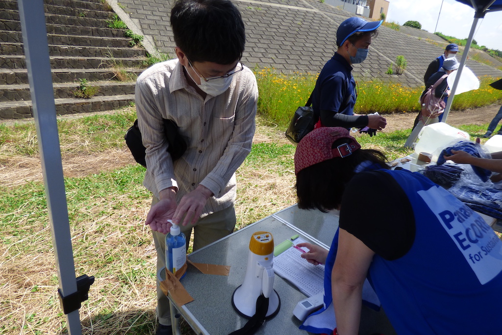 受付では、体温測定・手指のアルコール消毒・体調の問診を全参加者に実施し、ペットボトル水を配布、新型コロナと熱中症の両方に万全の対策を施しました。