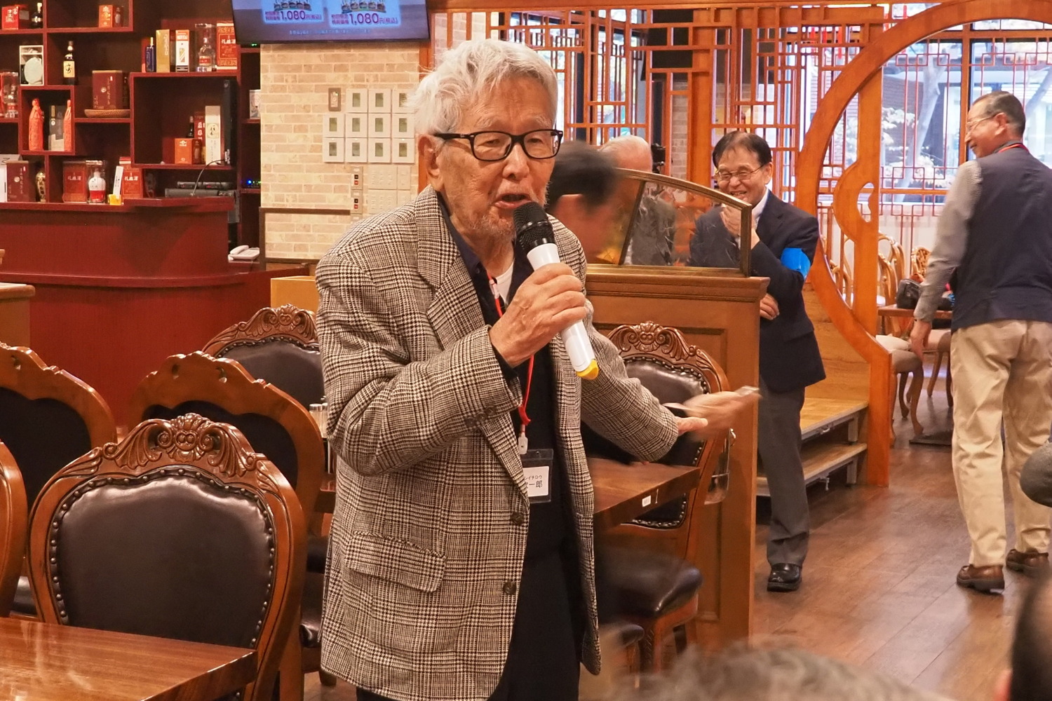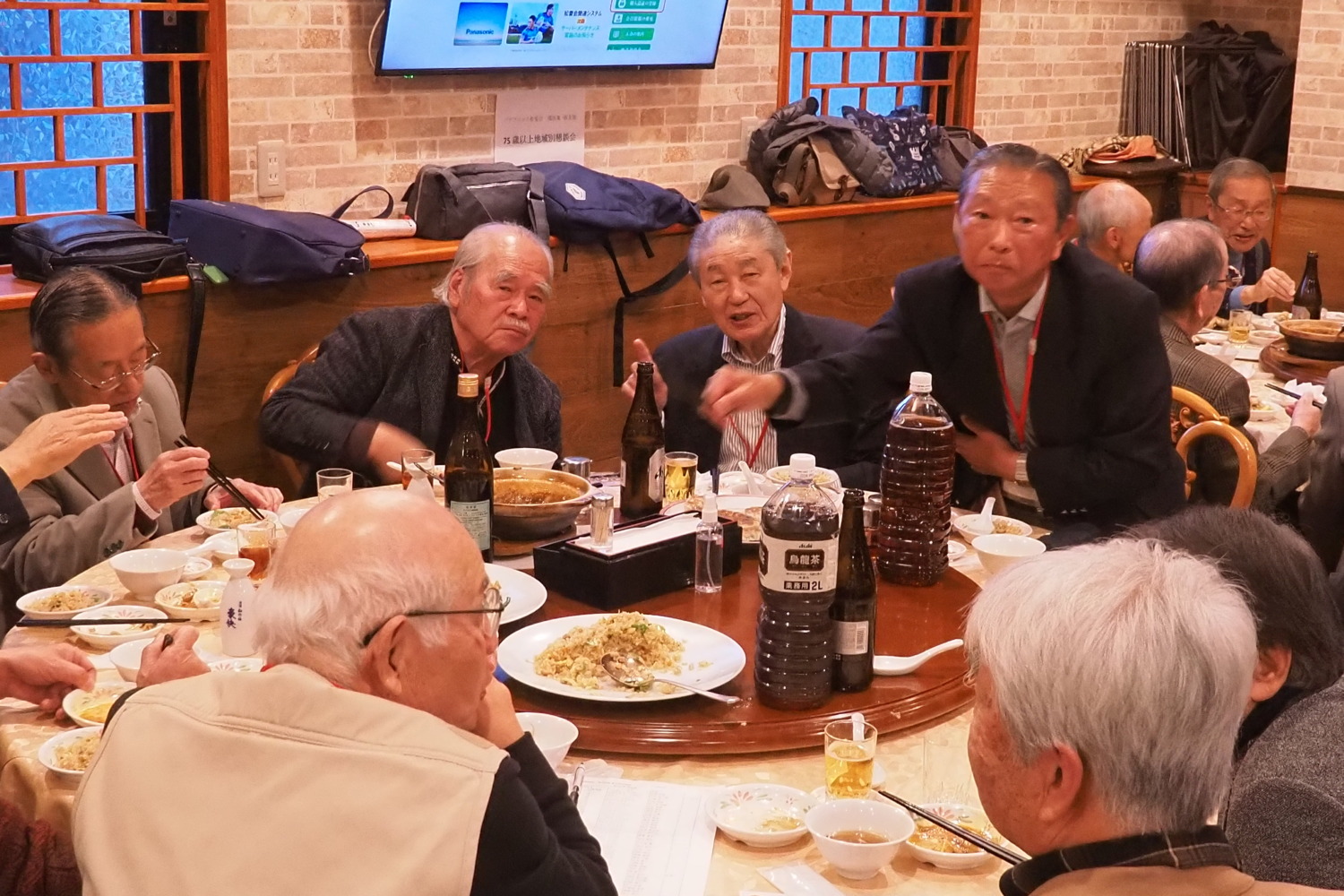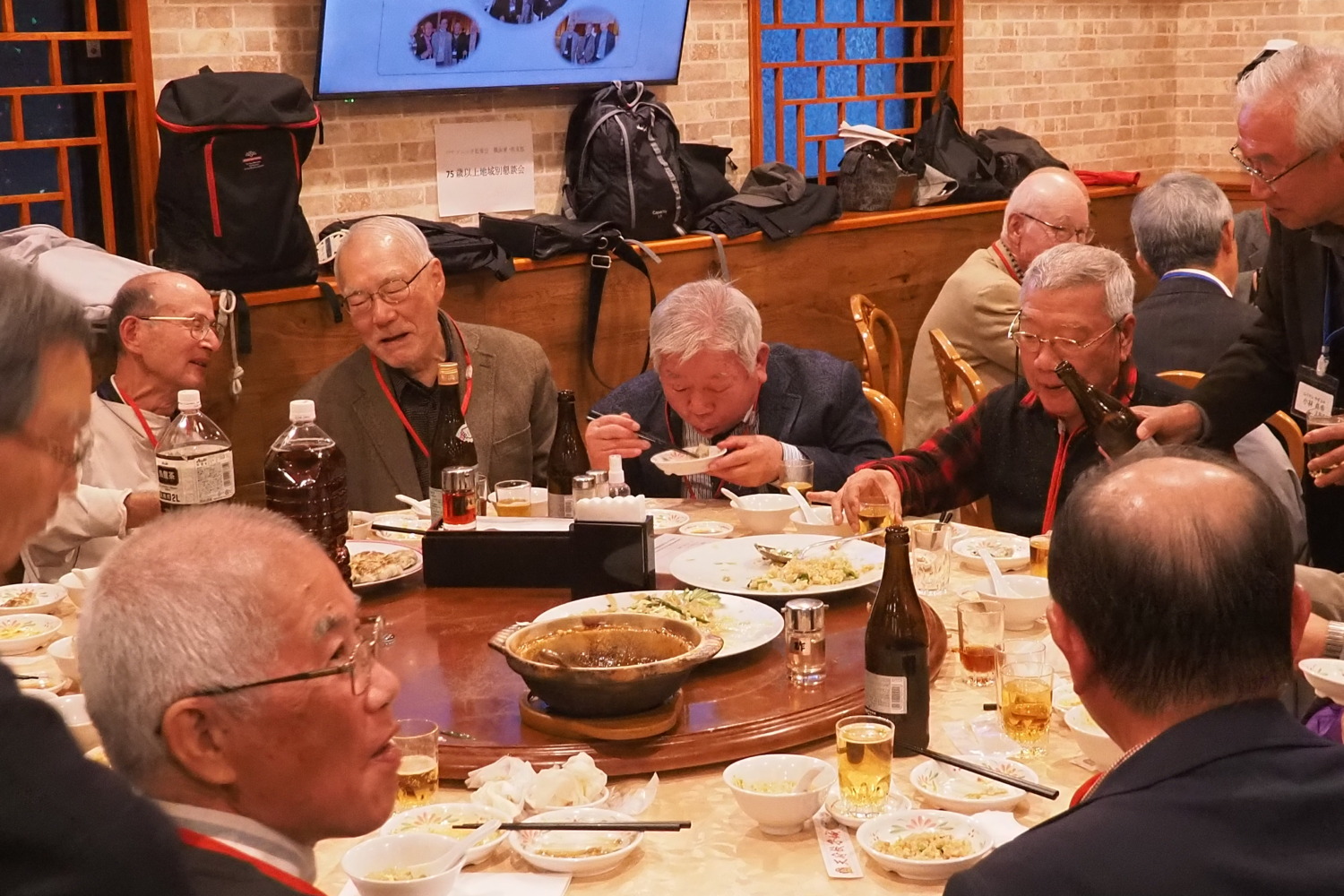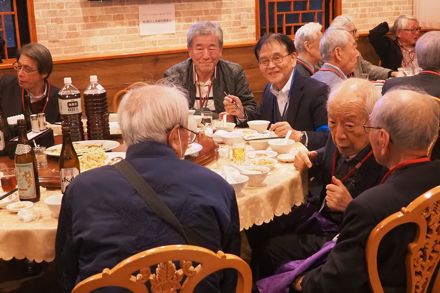 第2会場は新横浜駅より徒歩4分の「アジア中華創作料理 天府餃子城」(中華料理)。当日は、横浜市緑、神奈川、港北、西、中、鶴見、 保土ヶ谷区 在住、75歳以上の対象会員57名 担当の支部役員7名の総勢64名の方が参加 最高齢94歳(90歳以上3名) 平均年齢80歳でした。